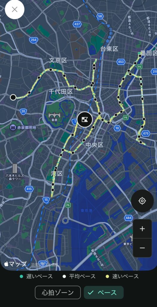 | 都庁スタート → 市ヶ谷あたり | ~5 km | スタート直後は下り基調でペースが上げやすく、気持ちよく走り出せる |